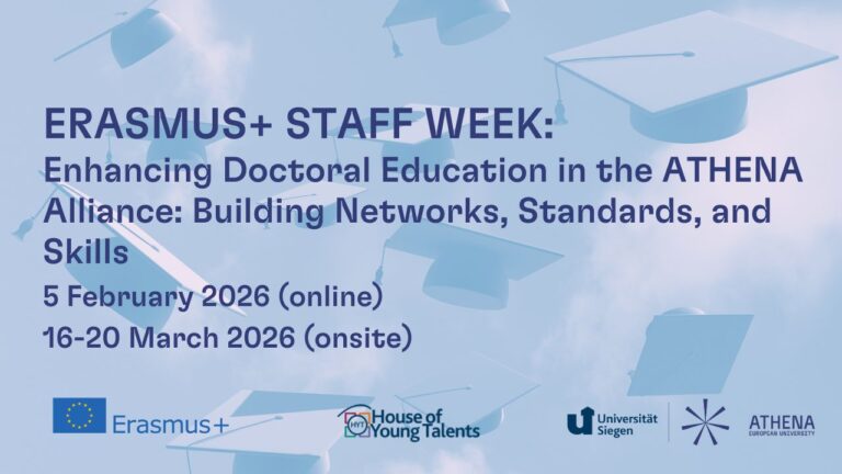 The ATHENA team, House of Young Talents and the International Office of the University of Siegen look forward to welcome you for our Blended Intensive Program (BIP) in Siegen! We will focus on enhancing doctoral education in the ATHENA Alliance. By sharing best practices and